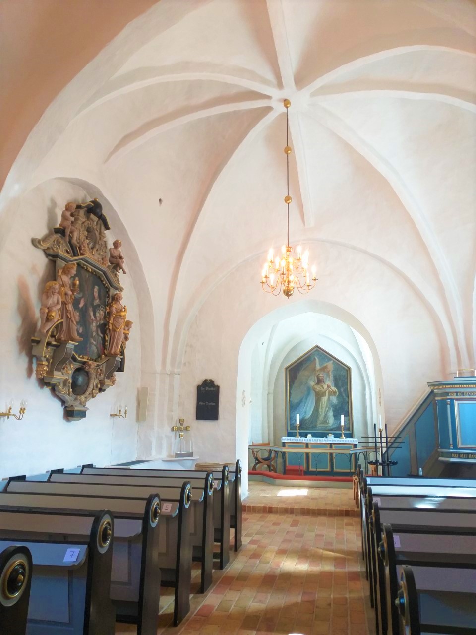 Indvendigt var der tidligere et fladt træloft i både skib og kor. Væggene har været bemalet med kalkmalerier. Ved en afbankning af væggene for gamle kalklag, kunne man se store figurer i middelalderdragter, og man kunne se, at væggene i koret har været malet sådan, at de skulle forestille et klæde, der var draperet på ringe, der hang på gardinstænger. Desværre var malerierne for ødelagte, og blev derfor malet over igen. De eneste tilbageværende kalkmalerier er to indvielseskors i kordørens sider og en vase med en plante øverst i midterhvælvingen.