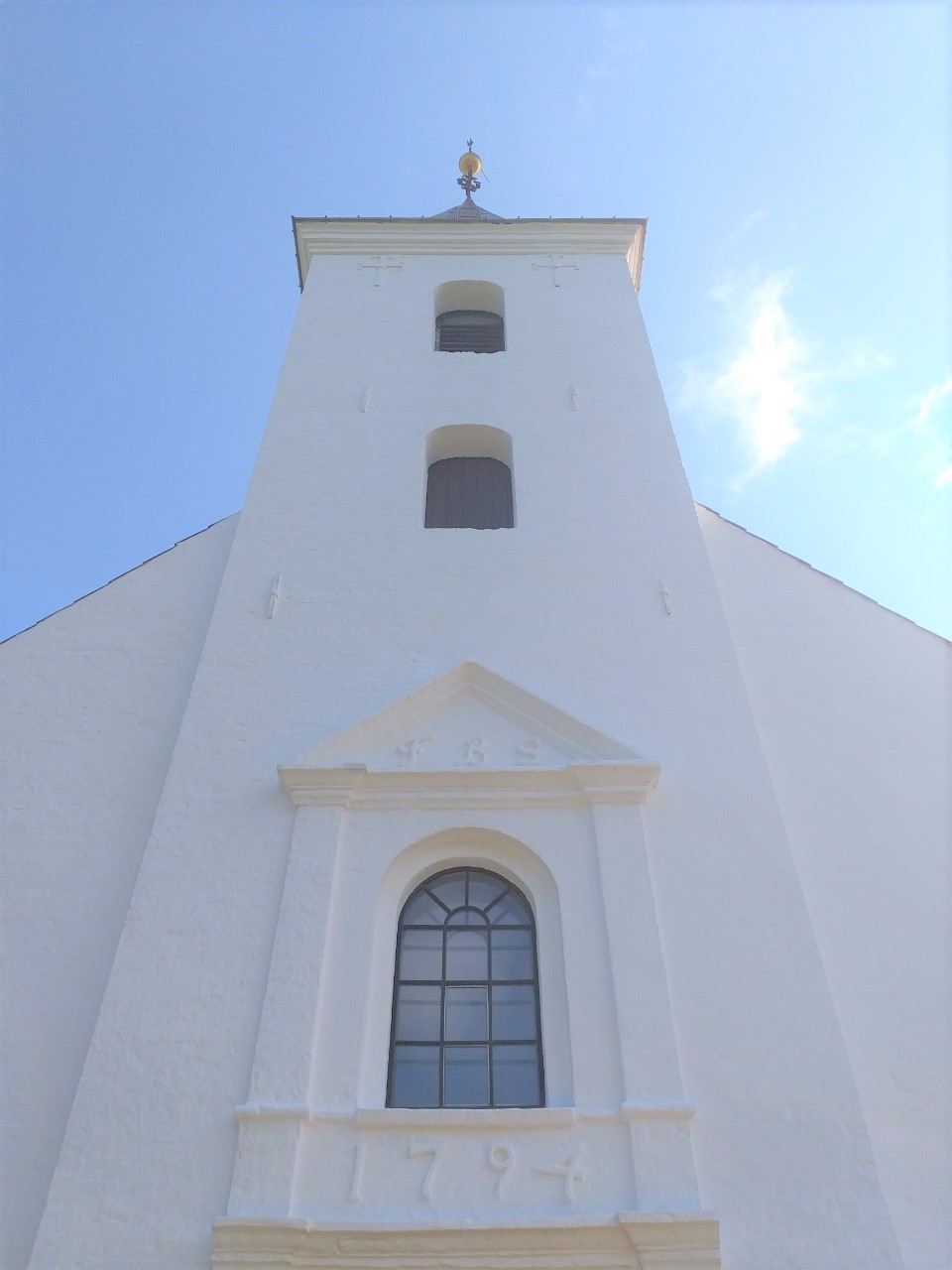 Her ses kirkens tårn fra vestsiden med årstallet 1794 og initialerne FBG.